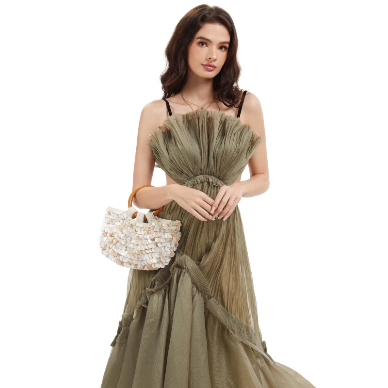 Designed to turn heads, this pearl-toned handbag is crafted with layers of round shell-like sequins that shimmer softly with every movement. The warm wooden ring handle adds a natural, modern contrast, while the textured finish gives the bag a luxe, resort-ready feel. Perfect for brunch, vacations, parties, weddings, and any outfit that needs a polished focal point.
