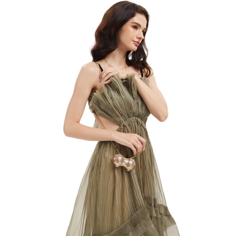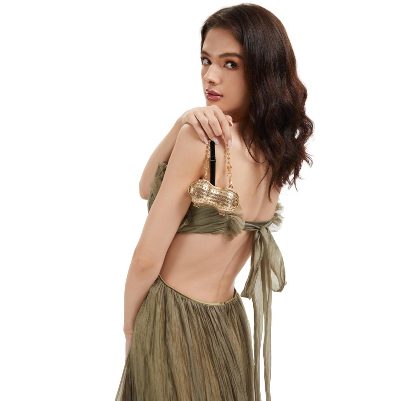Add a playful touch of glamour to your look with this peanut-shaped mini clutch. Designed with a structured hard-case silhouette and all-over rhinestone sparkle, it shines like jewelry in the light. Comes with both a short and long chain, so you can style it as a handheld mini bag or wear it on the shoulder/crossbody for special nights out.