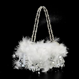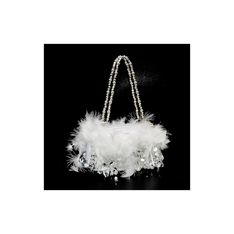 Dreamy and glamorous, this evening bag combines soft white feather trim with shimmering sequins for a show-stopping look under lights. Finished with a sleek metal frame and a chain strap, it can be worn on the shoulder or carried as a clutch—perfect for weddings, parties, dinners, and special celebrations.
